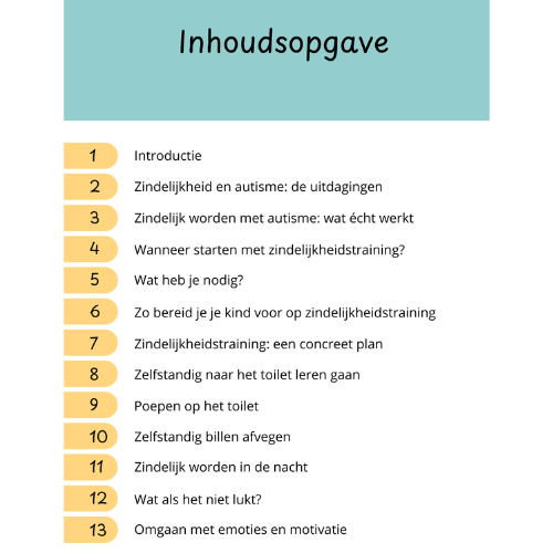 Help je kind stap voor stap zindelijk worden met deze praktische gids, speciaal geschreven voor ouders en opvoeders van kinderen met autisme. Dit e-book, geschreven door een ervaren gedragsdeskundige, biedt een gestructureerde aanpak, bewezen strategieën en praktische tips om zindelijkheidstraining succesvol aan te pakken.